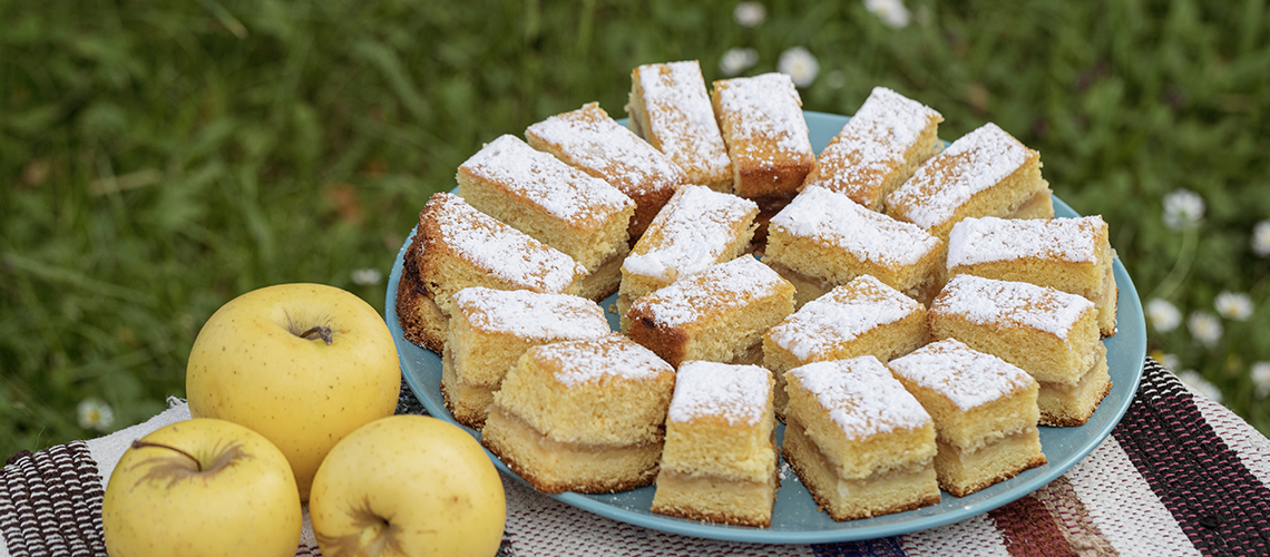 Vegyed ki a piskótát a sütőből és terítsd rá az almás tölteléket.