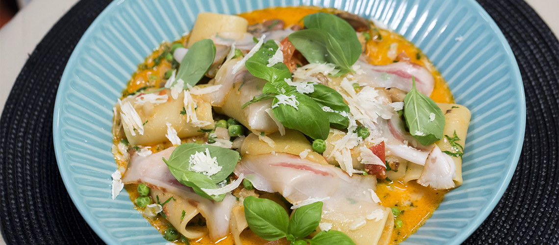 Tegyük a tésztára a paradicsomsalsát, díszítsük szalonnával, adjuk hozzá a borsót, majd reszelt citromhéjjal, fekete borssal és sajttal tálaljuk.