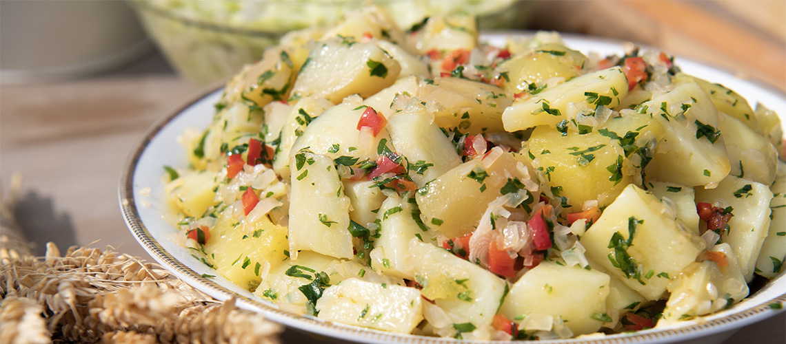 A burgonyát héjában megfőzzük, meghámozzuk és szeleteljük.