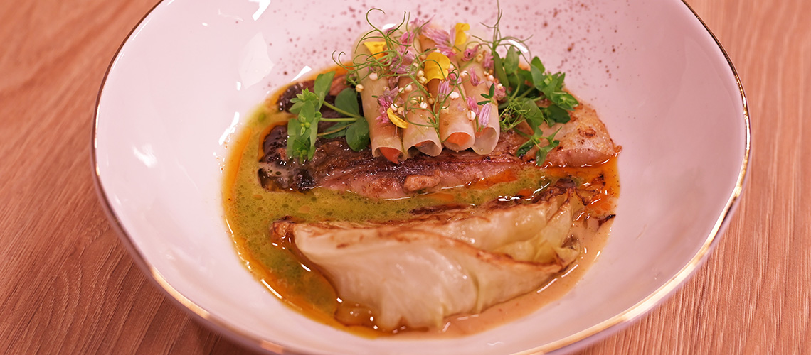 A pontyot kifilézzük, beirdaljuk, majd besózzuk és hagyjuk állni legalább 1 órát. A bőrös felével lefelé serpenyőben ropogósra sütjük, majd 80 fokoks sütőben pihentetjük 10 percet.