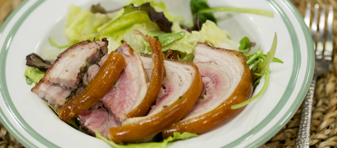 A formázott, előkészített sertés császáthúst, a belső, húsos oldalán sóval, pácsóval, borssal, vágott fokhagymával, frissen vágott petrezselyemzölddel és rozmaringgal ízesítem. Bőrös oldalával kifelé feltekerem és azért, hogy beférjen a háztartási sütőbe, félbevágva hurokkötözéssel formázom. 180 fokos sütőben 2 órán keresztül sötöm, majd feltekerem a hőmérsékletet és 250 fokon, kb 20 percig ropogósítom. A porchetta szeletekhez salátát készítek. Jégsalátát tépkedek, szárított paradicsom pácolajához étolajat, fehér balzsamecetet, mustárt, sót, borsot és porcukrot keverek. Tálalás előtt a jégsalátához szárított paradicsomot, olíva bogyót szeletelt lilahagymát, és az öntetet keverem. A hideg hússzeleteknek a salátával megágyazva szervírozom.