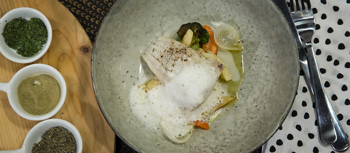 A 80 fokra felhevített olajhoz hozzáadjuk a meghámozott salottát, a fokhagymát és a fűszernövényeket. Hagyjuk puhára főni: ízesített olajat kapunk. Hozzáadjuk az megfűszerezett tőkehalfilét. Puhára konfitáljuk. A zöldségeket nagyobb darabokra vágjuk, és forrásban lévő vízben megfőzzük. Kevés fűszerolajon megpirítjuk. Tej és kevés bor keverékébe tegyünk egy kis kakukkfüvet, rozmaringot és petrezselymet. Hagyjuk felforrni, és botmixerrel egyn eműsítjük.