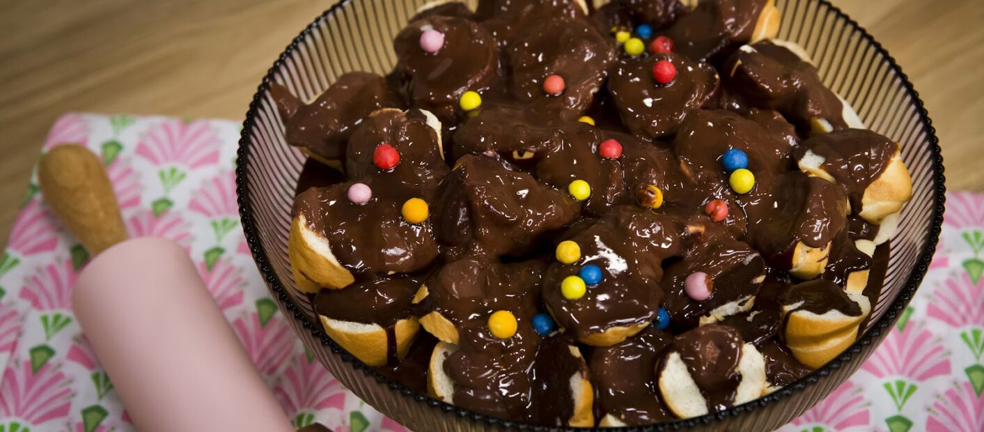 Egy tálcára rétegesen croissant/kifli, pudingot, majd csokoládét teszünk.