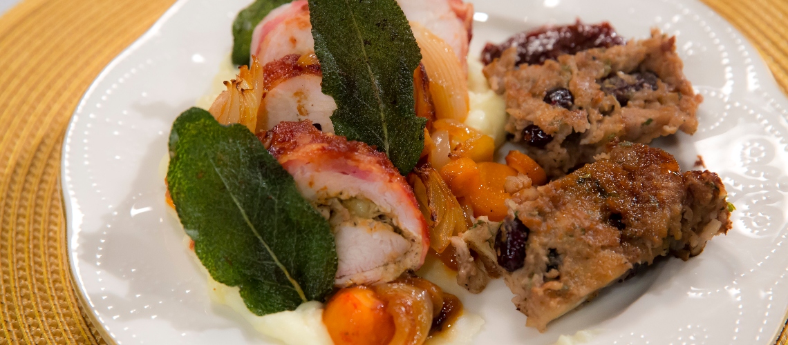 A töltelékhez összekeverünk tejszínt, tojást, tökmagot, mogyorót, szegfűszeget és a csíkozott paprikát és apróra vágott petrezselymet. Beletesszük a szeletekbe és feltekerjük.