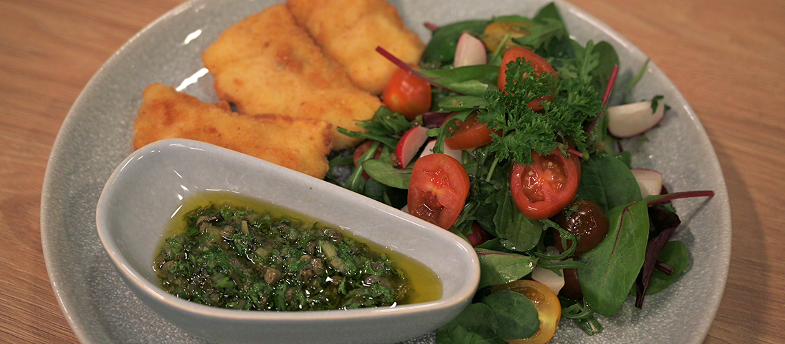 A csíkozott halszeleteket sózzuk, majd lisztbe, felvert tojásba, zsemlemorzsába forgatva bundázzuk és bő forró olajban néhány perc alatt aranybarnára sütjük. Közben az uborkát, petrezselymet, capri bogyót nagyon apróra vágva összekeverjük. Mézzel, citromlével, olívaolajjal sóval, borssal öntetet készítünk és kb a felével összeforgatjuk az apróra vágott öntetet. A felezett paradicsomot és retket a salátára halmozzuk, majd lelocsoljuk a maradék öntettel. Tálaláskor külön kínáljuk a mártogatóst.