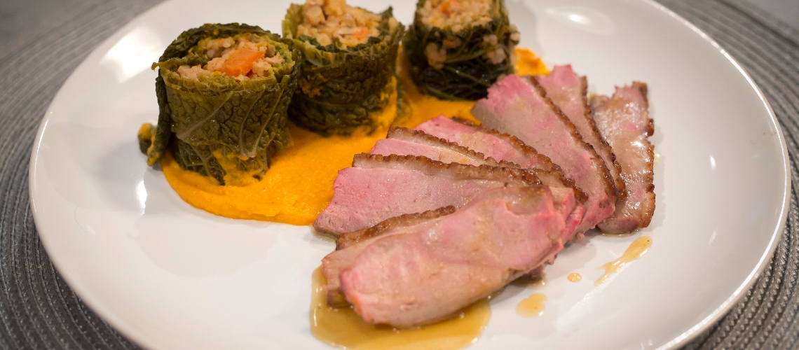 Hagyjuk kihűlni az árpát. Elkeverjük a tojással, a fokhagymával, a sült tökkel, a répadarabokkal és a dióval, majd a puha kellevelekbe rakunk levelenként félmaréknyit. A leveleket feltekerjük, a szélüket benyomkodjuk.
