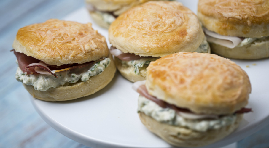 A tésztához a lisztet elmorzsoljuk a hideg vajjal. Hozzáadjuk a sütőport, a sót, a tejet, a tejszínt és egy tojást. Begyúrjuk, kinyújtjuk, kiszaggatjuk pogácsaszaggatóval. megkenjük a tojással és megszórjuk a reszelt sajttal. 190 fokon 10-15 perc alatt megsütjük a pogácsákat. A sajtkrémet kikeverjük az aprított zöldfűszerekkel. A kettévágott zöldfűszeres sajtkrémmel megkenjük a scone-okat és egy-egy szelet sonkát teszünk rá.