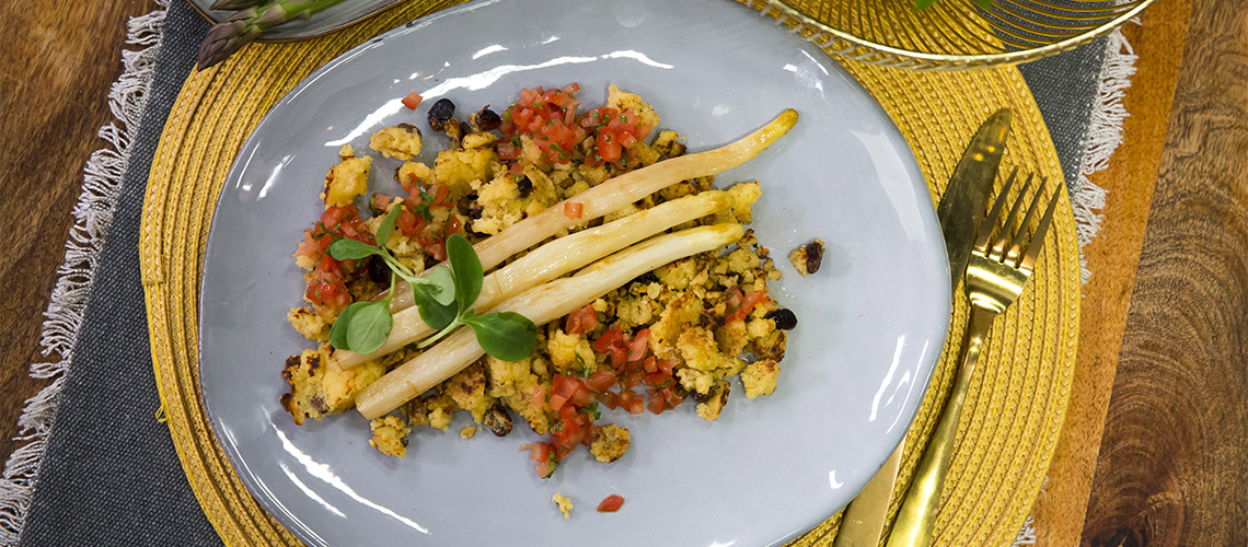 Tálaláskor a sült sós daramorzsát a spárgával együtt kínálod, és a tetejére vagy mellé helyezed a bazsalikomos-paradicsomos feltétet.