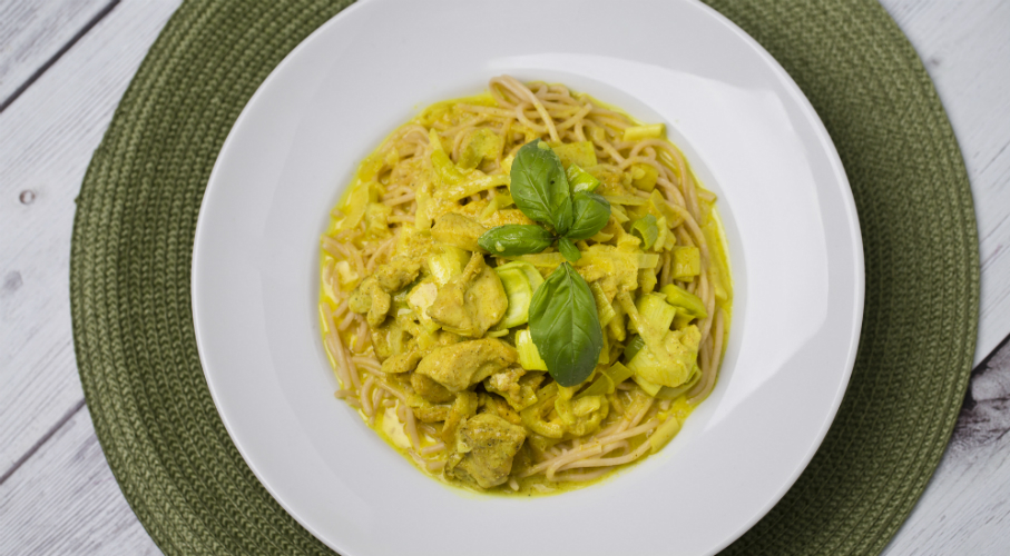 Először olajos, sós vízben megfőzzük a spagettit (így nem tapad össze). A csíkokra vágott csirkehúst megszórjuk sóval, borssal és megpirítjuk az olajon. Megszórjuk curry fűszerrel, hozzáadjuk a póréhagymát és a félkarikákra vágott hagymát. Felöntjük egy kevéske vízzel és tejszínnel, amitől szépen besűrűsödik a mártás. Összekeverjük a spagettivel és azonnal tálaljuk.