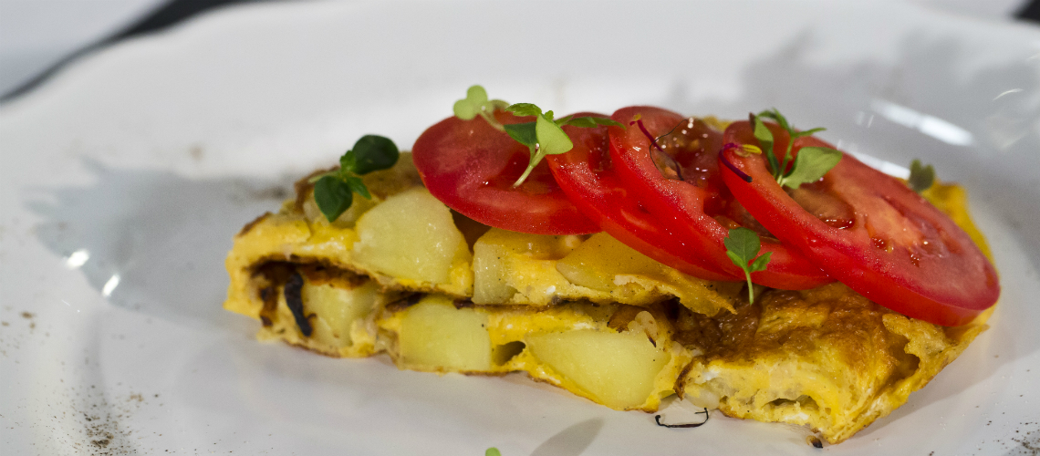 Egy lábosban olajat melegítünk és hozzáadjuk a meghámozott és felkockázott krumplit. Kb 4 perc múlva hozzáadjuk a hagymát – figyeljünk oda, hogy csak pároljuk, lassú tűzön. Fedő alatt 20 percig pároljuk, néha megkavarjuk. Felverjük a tojásokat, sózzuk, borsozzuk, majd ráöntjük a krumplira. Teflon serpenyőben fél kanálnyi olívaolajat melegítünk, a tojás és burgonya keverékét a serpenyőbe tesszük és 10 percig sütjük. Egy tányér segítségével megfordítjuk, és a másik felét további max. 6 percig sütjük. Friss paradicsommal tálaljuk.