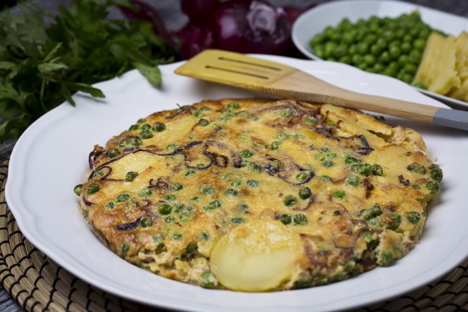 Egy tálban alaposan összekeverjük a tojásokat, a hagymát, a krumplit, a borsót, a metélőhagymát, valamint a sajtot. Egy serpenyőben napraforgóolajat melegítünk, a tojásos masszánkat beleöntjük, és lassú tűzön megsütjük mindkét oldalát.