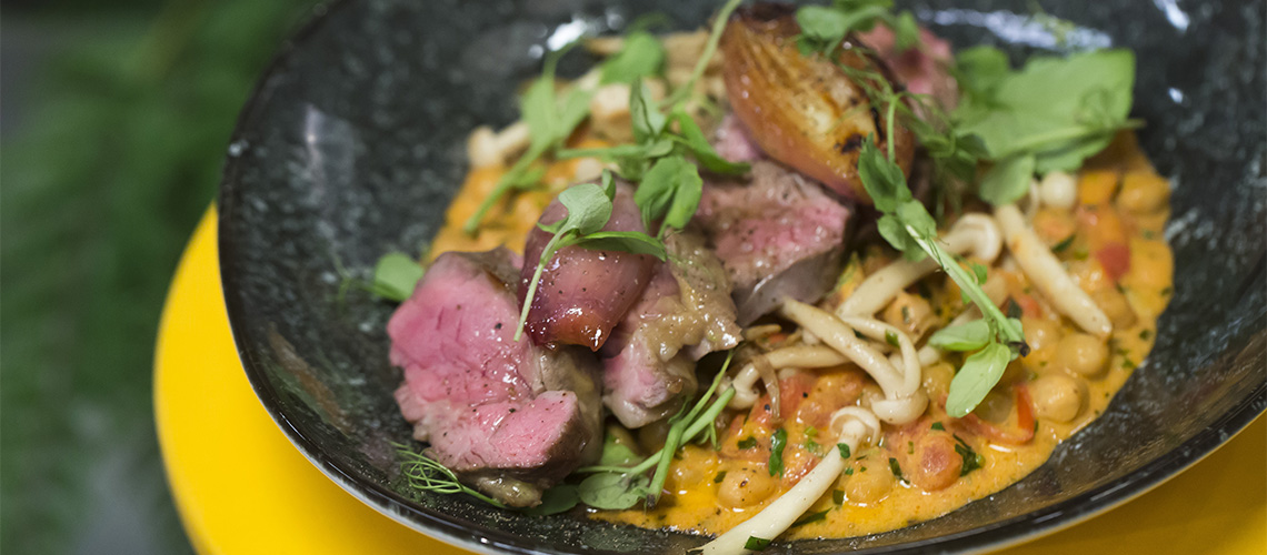 A salottát félbevágva kevés olajon a vágott felével lefelé olajon megpirítjuk. Cukrot és vajat teszünk hozzá, ecettel, mézzel és ízlés szerint kakukkfűvel a kívánt állagúra redukáljuk. Amikor szükséges, kevés vizet adunk hozzá. Lime levével, sóval, mézzel és friss fekete borssal fűszerezzük. A húst felvágjuk, mindkét oldalán enyhén sózzuk és serpenyőben röviden átsütjük mindkét oldalán. Ezután kakukkfüvet rakunk rá és sütőbe rakjuk. Amikor kész, a húst kivesszük a serpenyőből, megkenjük mustárral, és pihentetjük. Serpenyőben vajon prítani kezdünk fokhagymát, majd belekeverjük a csicseriborsót, kissé sózzuk, és a paradicsommal, kakukkfűvel, tárkonnyal (vagy egyéb szezonális zöldfűszerekkel) főzni kezdjük. Felöntjük alaplével, hozzáadjuk a tejszínt, borsot, tárkonyt és garam masalát, majd redukáljuk. Közben kis lime levet is csöpögtetünk rá. A gombát tárkonnyal megpirítjuk vajon, sózzuk, a szószhoz adjuk és hússal tálaljuk.