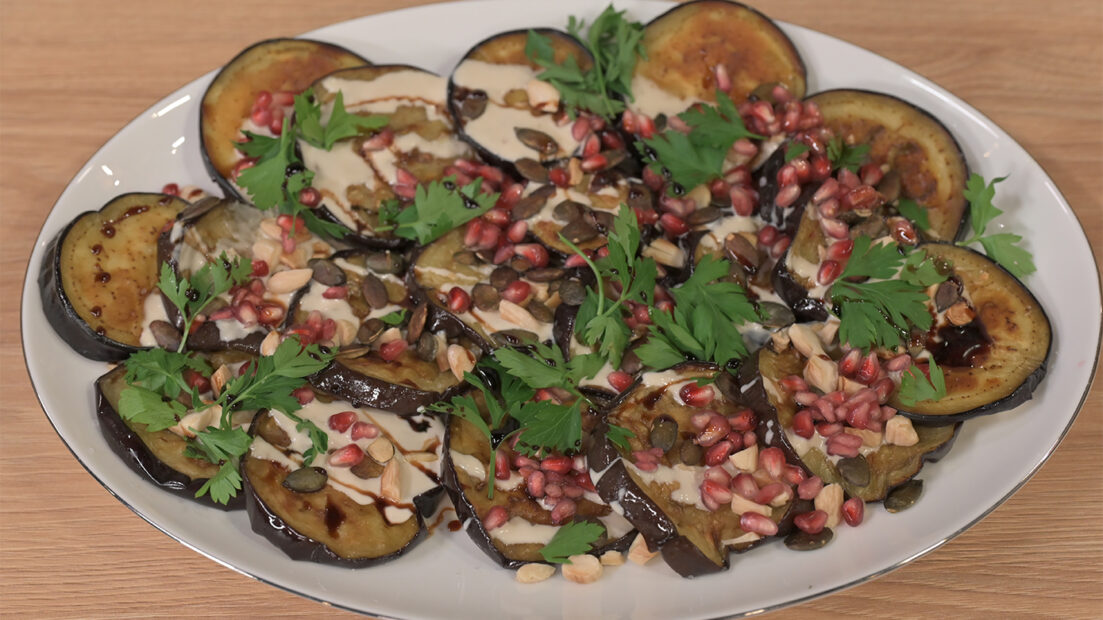 A padlizsánokat középvastag (mondjuk 1,5 cm-es) karikákra szeletelem. Egy alufóliával bélelt tepsit meglocsolok olívaolajjal, megszórok sóval, borssal és ráteszem a padlizsánokat. A tetejüket szintén megkenem az olajjal és fűszerezem. 20 perc alatt pirosra sütöm. Amíg sül, elkészítem a dresszinget: a joghurtot simára keverem a tahini-vel , az összenyomott fokhagymával és ízlés szerint sózom). Amikor a padlizsán megsült, mindkét oldalát egy kenőecsettel megkenem a gránátalmaszósszal és körben elrendezem egy tálon (*az eredeti recept gránátalmaszirupot ír összekeverve vörösborecettel. Meg kell nézni az gránátalmaszósz összetevőit, ha azok között citrom, vagy citromsav is szerepel, akkor nem szükséges az ecet). Meglocsolom a joghurtos dresszinggel és a tetejét megszórom a pirított fenyőmaggal (vagy dióval) és a gránátalmával. (A gránátalmából úgy lehet legkönyebben kiszabadítani a rózsaszín magokat, ha először levágjuk a gyümölcs koronáját, majd függőlegesen 4-5 cikkelybe vágjuk. ) Előre elkészíthető.