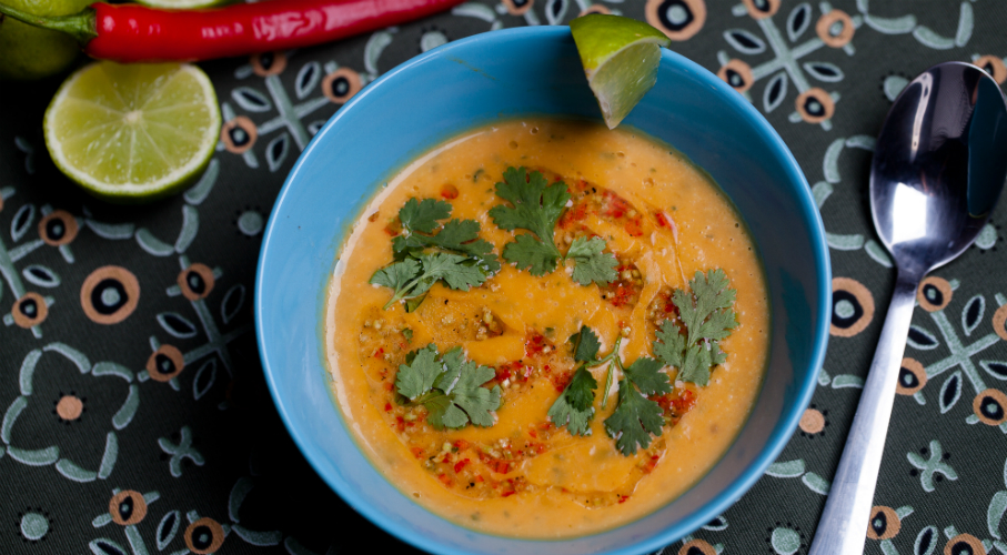 A sütőtököt kockára vágjuk, majd olívaolajon 30 percig puhára és aranybarnára pirítjuk. Egy másik serpenyőben a vajat olívaolajjal felmelegítjük. Rászórjuk a hagymát, fokhagymát, koriander magot és 3/4 chili paprikát. Lefedjük és 15-20 percig pároljuk, míg a hagyma megpuhul. Hozzáadjuk a sütőtököt, az alaplevet, a tejszínt és simára turmixoljuk. Ezután felfőzzük és ízesítjük. A levest egy kevéske tejszínnel és aprított chili paprikával tálaljuk.