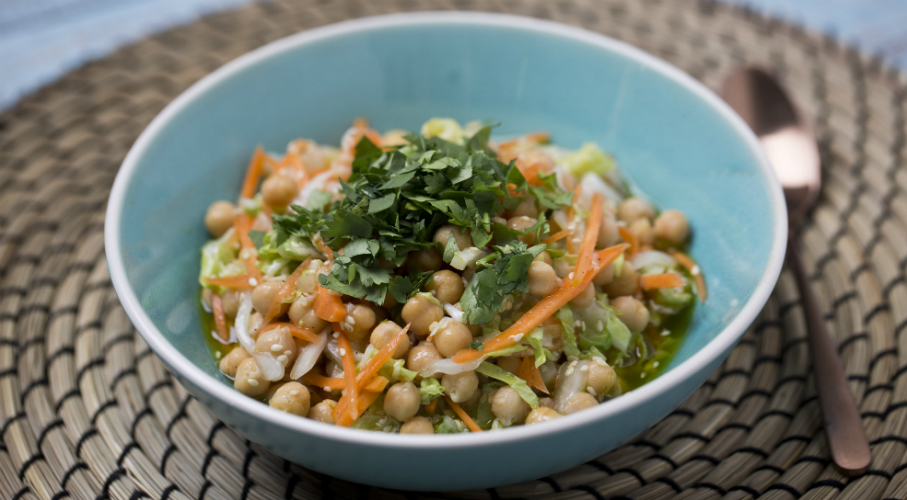 Zúzott fokhagymát, zúzott gyömbért, kevés mézet, almaecetet, sót, borsot alaposan összekeverünk. Felöntjük olívaolajjal. A vékony csíkokra vágott sárgarépát és kínai kelt összeforgatjuk a főtt csicseriborsóval, majd átkeverjük az öntettel. Friss korianderrel szórjuk.