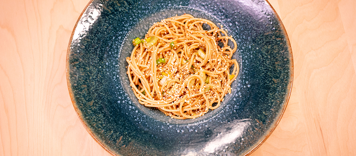 Egy tálban összekeverjük a szezámolajat, szójaszószt, rizsecetet és barnacukrot. A kifőtt tésztával összekeverjük. Az újhagymát és zellert vékony karikákra vágva hozzáadjuk. A cukorborsót blansírozzuk, a szezámmagot megpirítjuk és hozzáadjuk a tésztához.