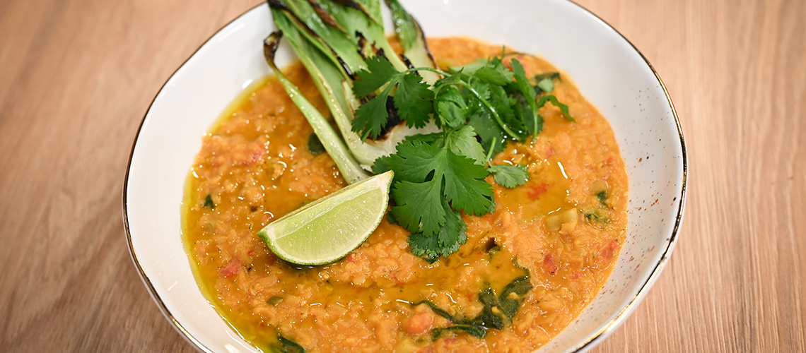 Egy lábasban felhevítjük az olajat, amelyben félig puhára dinszteljük a vékonyra szeletelt hagymát, a reszelt gyömbért és a fokhagymát. Hozzáadjuk a fűszereket: a kurkumát, a római köményt, a koriandert, elkeverjük, néhány percig pirítjuk, majd belekeverjük a kimagozott, felaprított chilit. Hozzáadjuk az átöblített vöröslencsét, átforgatjuk, majd felöntjük a kókusztejjel, a hámozott konzervparadicsommal és az alaplével (vagy vízzel). Sózzuk, borsozzuk. Fedő alatt kb. 25 percig főzzük, amíg a vöröslencse teljesen megpuhul és kissé pépesre fő, felveszi az összes folyadékot. A lencse a szép korallszínét a főzés során sajnos elveszíti. Közben néha ránézünk, ha túl sűrűnek tűnik, egy kevés folyadékkal pótoljuk a levét.