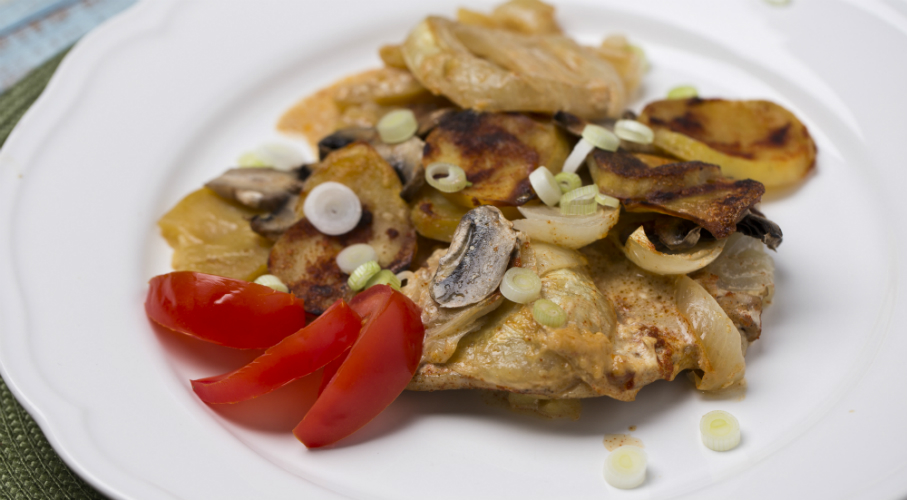 A sütőformát beolajozzuk. Beletesszük a karikára vágott, hámozott nyers burgonyát, megszórjuk sóval és őrölt csemege paprikával. A burgonyára helyezzük a karikákra vágott hagymát és gombát. Ezután ráfektetjük a karaj szeleteket, amiket előzőleg kiklopfoltunk, megszórtunk sóval és borssal. Végül az egészet megszórjuk egy kevéske szárított fokhagymával és csemege paprikával. A karajra teszünk egy újabb réteg hagymát, gombát, burgonyát, amit ismét megszórunk sóval és paprikával. A formát lefedjük, és 200 °C fokra előmelegített sütőbe tesszük 30 percre. Ezután leszedjük a fedőt, és további 30 percig sütjük.