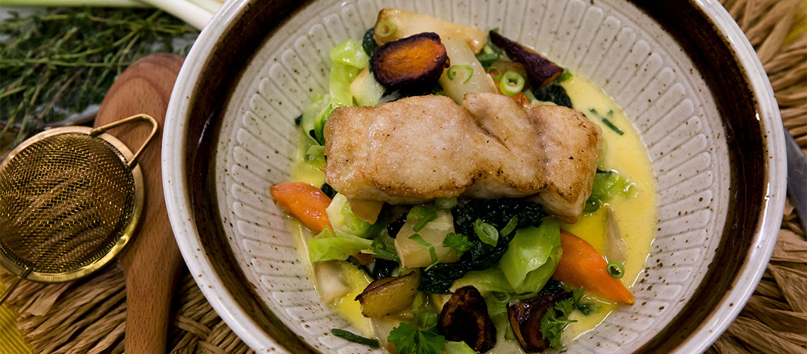 Vágjunk mindent zöldséget nagyobb falatnyi darabokra. A zöld zöldségeket mindig érdemes először blansirozni, tehát forró sós vízben gyorsan megfőzni, majd jeges vízben frissíteni, hogy szép zöldek maradjanak. A gyökérzöldségeket süthetjük sütőben,vagy serpenyőben is, így koncentrálódik az ízük. Ha ezekkel megvagyunk, tegyük félre őket felhasználásig. A harcsát vágjuk 18-22 dkg-os filékre. Készítsünk sóoldatot 12 dkg só és 2 liter víz felhasználásával. Áztassuk ebbe a sós vízbe a filéket 1-2 órára, függően attól, mennyire sósan szeretjük. Ha lejárt az idő, vegyük ki őket és szárítsuk le. A főzelékhez készítsük el az alapot, ehhez tegyünk fel 1 dl alaplevet forrni és alacsony lángon tartva lassan adagoljuk hozzá 10 dkg kockázott vajat. Sózzuk, borsozzuk, pár csepp citromlével és sok zöldfűszerrel ízesítsük. Ha gazdagabban szeretjük, adhatunk hozzá kevés tejszínt is. Az alaposan leszárított harcsát forró serpenyőben, kevés olívaolajon süssük pirosra, majd fordítsuk meg, vegyük lejjebb a tűzhelyet és dobjunk vajat a serpenyőbe. Ezzel a habzó vajjal locsolgatva süssük készre, ügyelve, hogy ne száradjon ki. Tálaláskor a vegyes zöldségeket melegítsük fel a vajas mártással, ha kell még ízesítsük és zöldfűszerekkel megszórva tálaljuk a harcsát a főzelékkel.