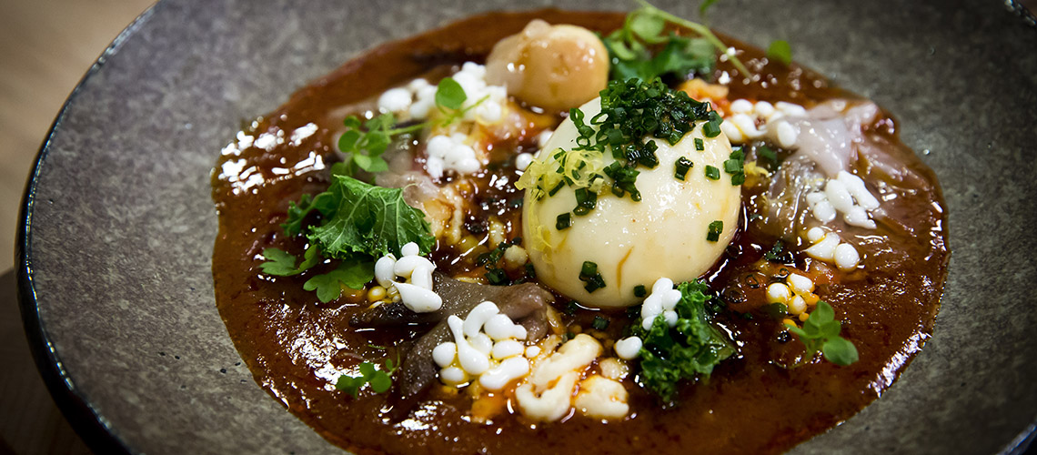 Paprikás alapot készítünk, majd ebbe tesszük bele a főtt és marinált tyúk és a füstölt fürjtojást. Köretnek speclét készítünk. Tálaláskor hajszálvékony mangalica szalonnát és zöldfűszereket adunk a pörkölthöz.