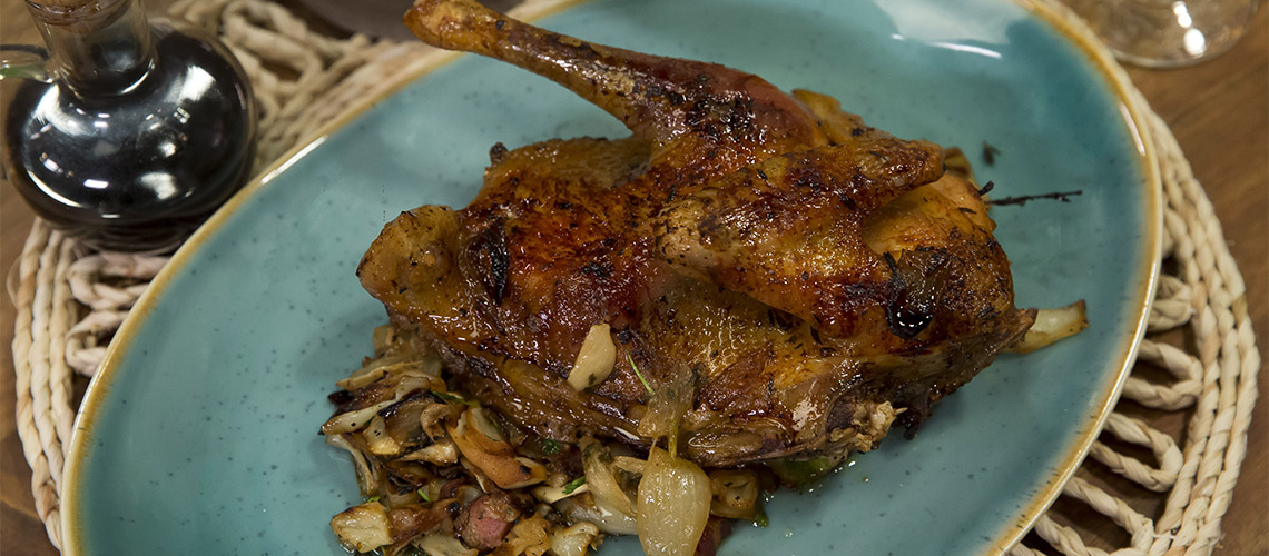 A csirkét felszeleteljük, fűszerezzük. Vajjal, fűszernövényekkel, citrommal, kevés vizet aláloccsantva kb. 1,5 órán át sütjük, közben a káposztát kisebb darabokra (négyzetekre) vágjuk. A szalonnát zsírjára pirítjuk, a káposztát addig sütjük rajta, míg sötét színt nem vesz fel. Ezután sóval, borssal és borecettel ízesítjük. A hússal, a csirkéből kisült szafttal meglocsolva tálaljuk.
