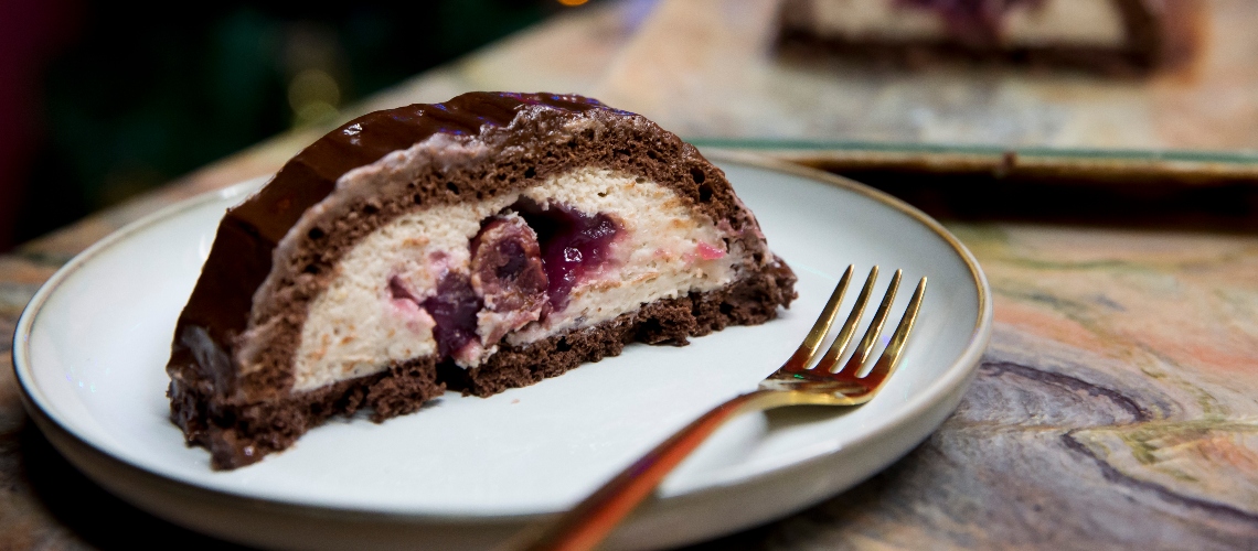 A piskótát méretre vágjuk, hogy ki tudjuk bélelni vele az őzgerincformát (folpackkal alatta), és maradjon egy téglalap az alagút tetejére is, ami majd a sütemény alja lesz. A piskótát ráfektetjük a folpackra, beletesszük a gesztenyekrém felét. A meggyragut átkeverjük, a sütemény közepére halmozunk egy csíkot belőle és ezt befedjük a maradék gesztenyekrémmel. A fedőpiskótát is ráhelyezzük és a folpackkal becsomagoljuk a süteményt. Hűtőben állni hagyjuk 4-6 órát, majd kiborítva a formából leöntjük a csokoládé mázzal és tálalás előtt visszahűtjük.