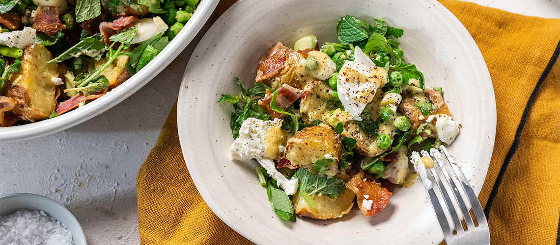 A kisült, langyos burgonyákat nagyobb falatnyi darabokra vágjuk és összeforgatjuk az öntet felével. A zöldborsót a serpenyőben maradt zsiradékon átpirítjuk és a burgonyához adjuk. A zöldfűszereket nagyobb darabokra vágjuk, az újhagymát felkarikázzuk és ezeket a salátához keverjük. Végül megszórjuk a nagyobb darabokra vágott ropogós baconnel és rámorzsoljuk a feta sajtot. A maradék öntettel is meglocsoljuk.