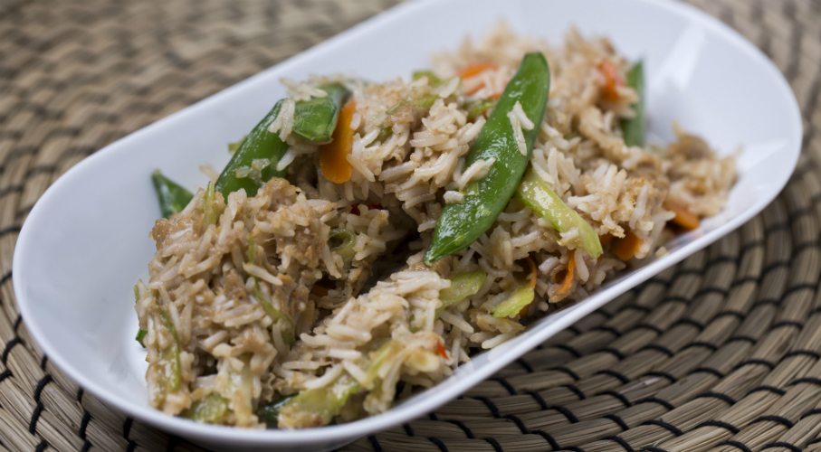 Zúzott gyömbért, fokhagymát, chili paprikát olajban megpirítunk. Hozzáadjuk a vékony lapokra vágott sárgarépát, zellerszárat, újhagymát és az egészben hagyott zöldborsót. Kissé lepirítjuk, majd beleöntjük a szójaszósszal elkevert tojásokat és a puhára főzött hosszúszemű rizst. Egybesütjük.