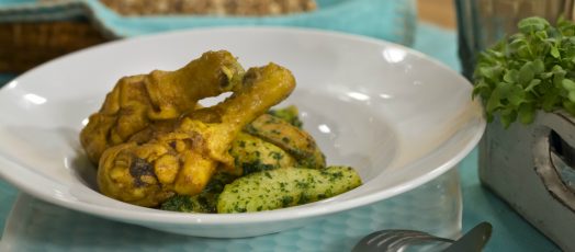 Zöldfűszeres-currys csirkesült rusztikus burgonyával