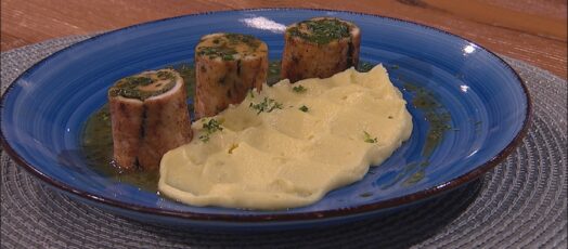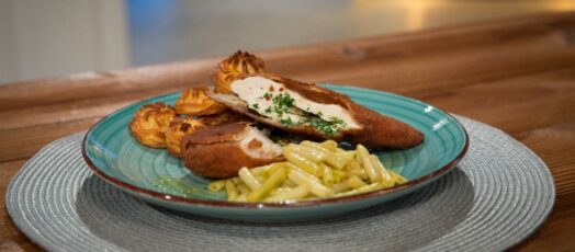 RUKKOLA PESZTÓVAL TÖLTÖTT POSÍROZOTT CSIRKEMELL, MÁRTÁSSAL ÉS TÖKÉLETES KRUMPLIPÜRÉVEL