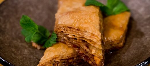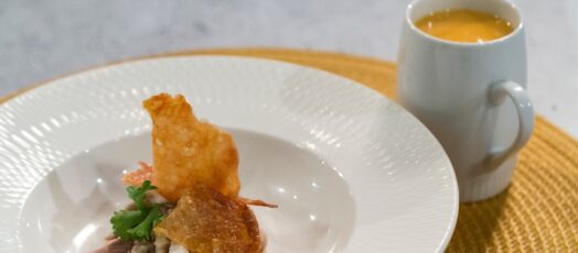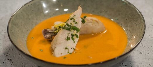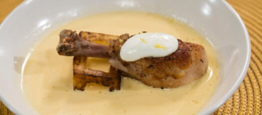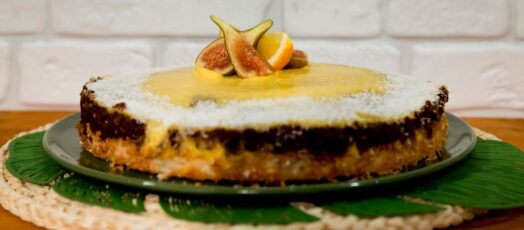 Kókusz mousse piskótával, marinált sárgadinnyével