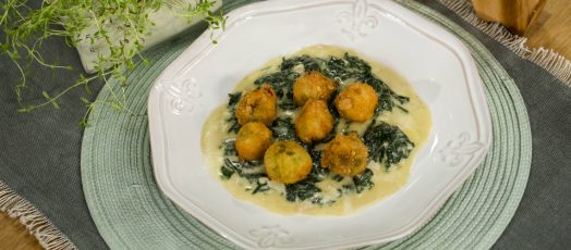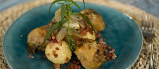Tárkonyos vajas sültcsirkecomb szalonnás túrógombóccal