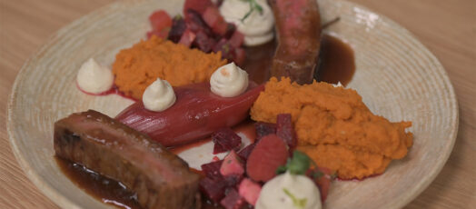 Flank stake karamellizált sütőtökkel, színes céklákkal, kecskesajttal és eper pürével marinált salottahagymával