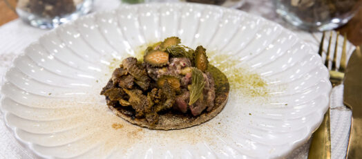 Őz tatár, fenyő majonézzel, erdei gomba szotéval, vakarón tálalva
