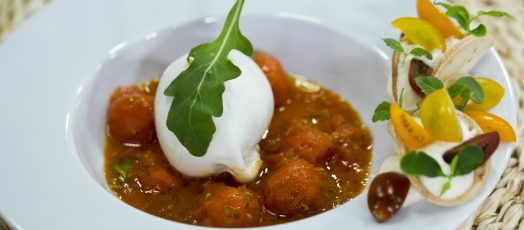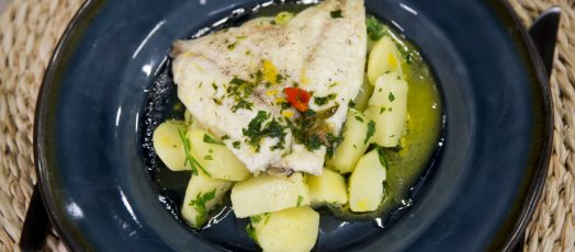Marhabélszín kakukkfüves burgonyapürével és lóbabos sült paradicsommal