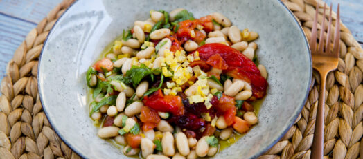Sült paprikasaláta fehérbabbal, zöldfűszerekkel