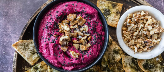 Kecskesajtos céklakrém karamellizált dióval