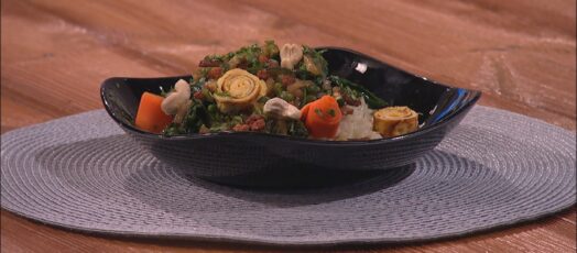 WOKOS KACSAMELL PIRÍTOTT ZÖLDSÉGEKKEL ÉS TOJÁSOS RIZZSEL